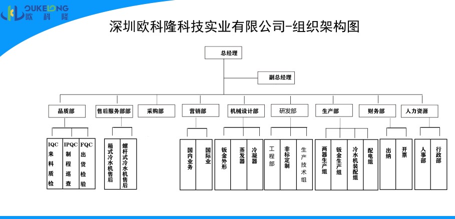 歐科隆制冷總經(jīng)理辦公室下轄九大部門,分別為:品質(zhì)部、售后服務(wù)部、采購部、營銷部、機械設(shè)計部、研發(fā)部、生產(chǎn)部、財務(wù)部、人力資源部。最高行政權(quán)、人事任免權(quán)為總經(jīng)理所有??偨?jīng)理下轄:銷售副總經(jīng)理,副總經(jīng)理。